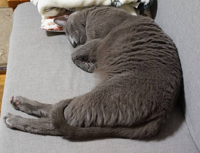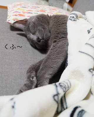 尻尾を脚に絡ませ、お手てもぎゅっと丸めてる